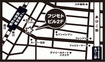 | お店までの道順 | JR我孫子町から我孫子商店街の方へ進み お肉屋さんの向かいフジモトビル2F |