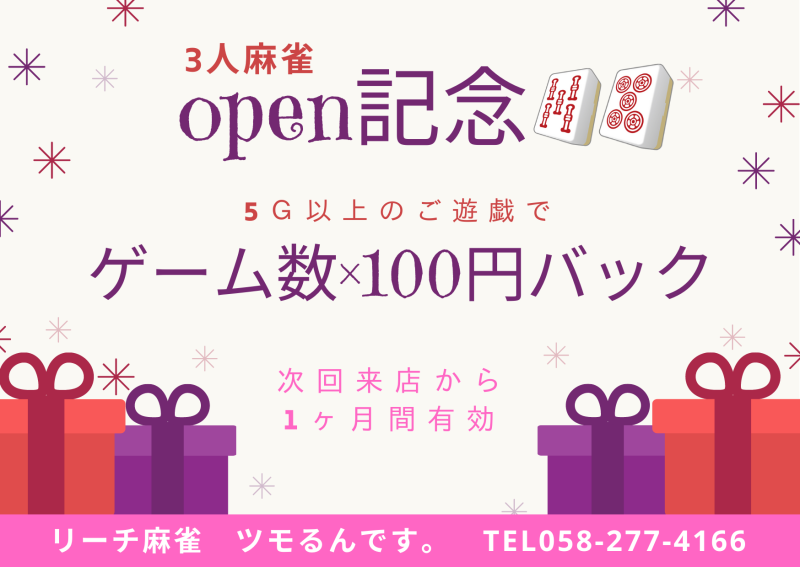 3人麻雀新規ご来店で1ヶ月間有効のチケットプレゼント!!