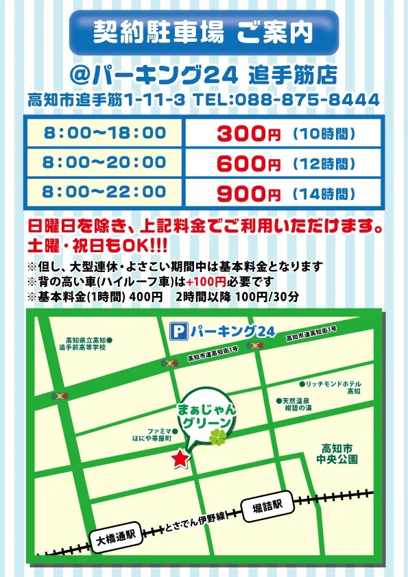 車でお越しのお客様へ、契約駐車場のご案内です。 ご不明な点につきましては、当店へお気軽にお問い合わせくださいませ。