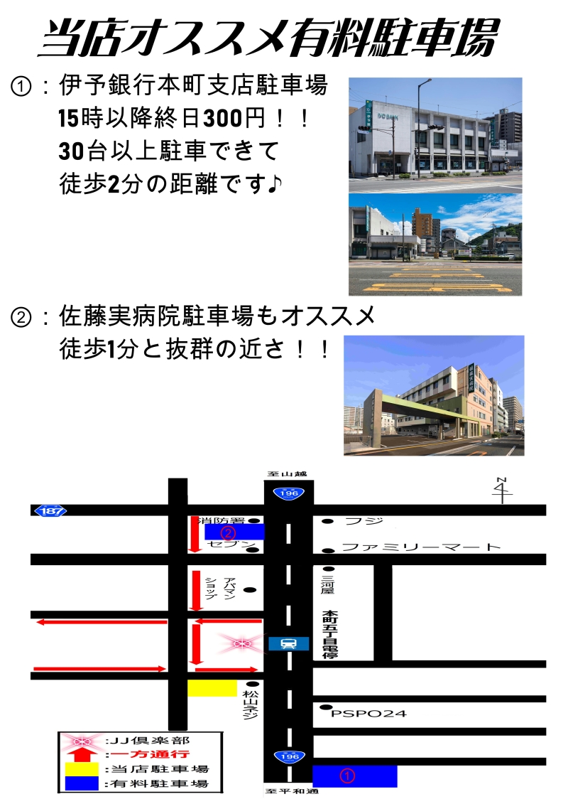| お店までの道順 | 北からの場合:フジ本町店・消防署のある交差点から南へ300M 南からの場合:平和通りと本町の愛媛銀行のある交差点から北に400M 本町5丁目西側バス停の正面が当店です! 駐車場は当店前通過後すぐの道を左折し、1本目の道をさらに左折、50mほど行くと左前方に看板付きの当店駐車場がございます! |