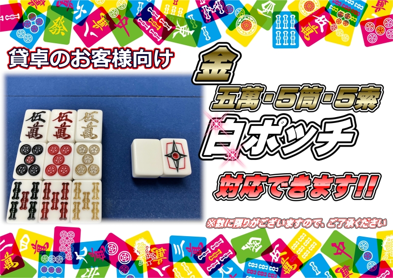 当店貸卓ではさまざまなルールで麻雀をされるお客様用に、金牌・白ポッチもご用意しております♪