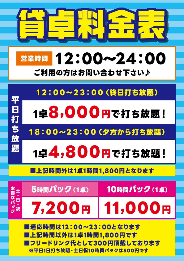 | 料金 (セット) | ・平日夕方(18:00~23:00)は4800円で打ち放題! ・平日は12時~23時までなんとお一人様2000円で打ち放題!(四名様の場合) ※上記以外のお時間は1時間1卓1800円です ・土日祝もお得なパック料金アリ! 5時間パック 1卓7200円 10時パック 1卓11000円 ※上記以外のお時間は1時間1卓1800円です ※また、別途ドリンク代を頂戴致します。 |
