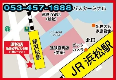 | お店までの道順 | 東海鉄道新幹線より北口を出て左にまっすぐ200M!遠鉄百貨店を通り過ぎて左手のローソンが目印です! 新浜松駅より改札出てすぐに左手に曲がると目の前に見えます! |