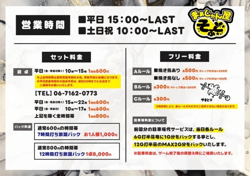| 基本サービス | フリードリンク, 駐車場補助, 持ち込みOK, 出前メニュー, 自動配牌卓, パック料金, Wi-fi完備, イベント・大会利用可 |