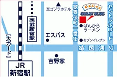 | お店までの道順 | JR新宿駅東口から歌舞伎町一番街に入り直進。ばんからラーメンの隣のビル4Fです。 |