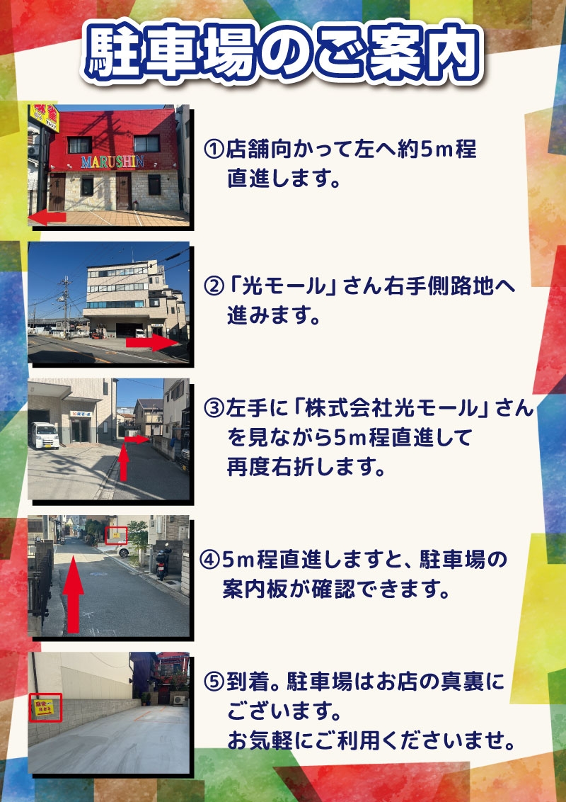 「駐車場完備」店の前と裏にございます。3月から新たに駐車場ご準備致します。しばらくの間ご迷惑お掛け致しますがご協力の程よろしくお願い致します。