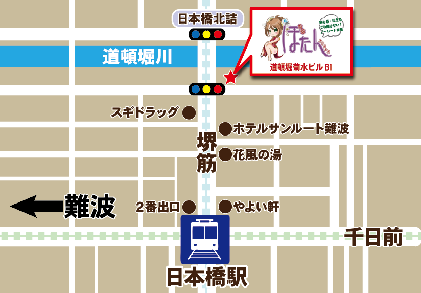 | お店までの道順 | 日本橋駅6番出口から堺筋の大通りを車の進む方向と同じ方向に進み 一つ目の信号を渡ったのちに右折するとぼたんに到着です! ※2025年2月初旬〜2025年12月末ごろまでの期間、改修工事に伴い6番出口が閉鎖となります。 期間中は日本橋2番出口(6番出口向かい側に出ます)を利用していただくと来店がスムーズです! |