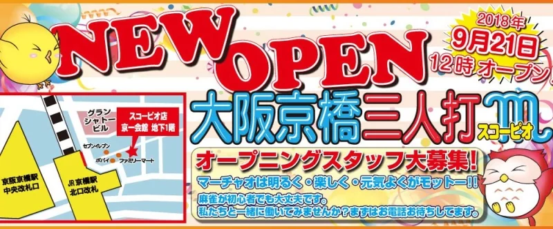 2022/4/1 ついに京橋3人打ち店に4人打ちが加わりリニューアルオープン!JR京橋駅から徒歩1分! まっさらな店内にゆったり19卓を完備!2023年2月より三人打ちがアリアリになりました!