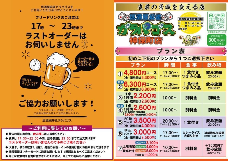 2019年5月7日、高田馬場・渋谷で人気のガラパゴスが神保町に上陸! 昼間は曜日によって「麻将教室」「健康麻将」を開催♪ 夜は大人気の居酒屋麻雀店として営業!