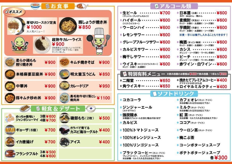 | 料金 (セット) | 一般:1卓1時間2,200円 金・祝前日は2,600円 個室:1卓1時間2,600円 金・祝前日17時以降は2,600円+個室使用料3,000円 お得なお食事付、飲み放題プランもございます! 1食付き+つまみ3点+飲み放題 4,800円(金・祝前日は5,300円) 個室は6,300円(金・祝前日は6,800円) 17:00~23:30(ゲーム代込み) 1食付き+飲み放題 3,500円(金・祝前日は4,000円) 20:00~23:30(ゲーム代込み) |