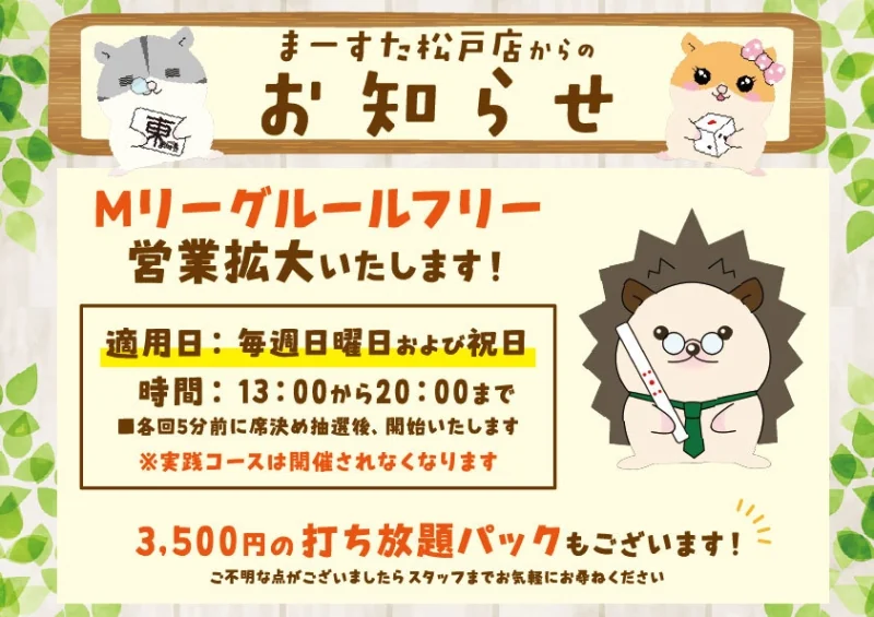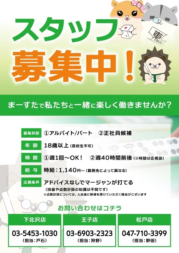 | お店のPR | 年中無休の健康マージャン店です! 松戸駅西口キテミテマツドの中にあるので気軽に立ち寄れます♪ スタッフは女性が多く、女性・初心者に優しいお店です。 雀荘デビューに最適です☆貸卓も随時受け付け中です! |