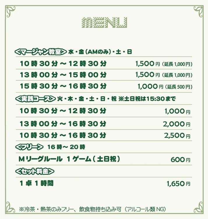 | 料金 (その他) | <実践> 10時30分~12時30分:1000円 13時~~15時30分(平日は16時30分):2000円 10時30分~15時30分(平日は16時30分):2500円 <Mリーグルールフリー> 1G:600円 |
