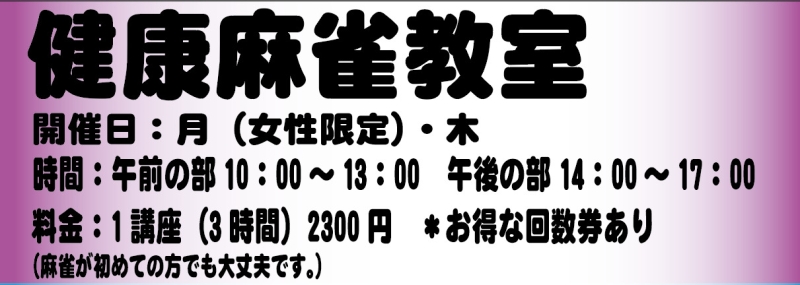 | 営業時間 | 【教室】 月・木 教室 午前の部10時~13時 午後の部14時~17時 1コマ2400円 回数券10枚21000円 初回or紹介購入特典 12000円(9000円OFF) 土 2時間制教室 10:00~12:00 【健康麻雀】 火・水・金 10時~17時 土 12時~20時 30分延長 300円 3時間パック 1900円 1日打ち放題 2800円 男女兼用【Mリーグフリー】 土・日 12時~20時 1ゲーム500円 【貸卓】 貸卓平日10時~22時 土日12時~ |