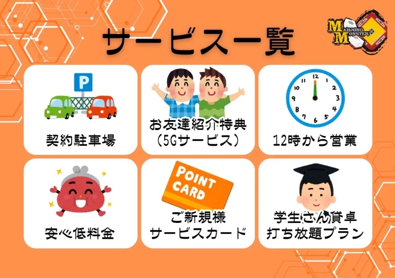 | 基本サービス | フリードリンク, フリードリンク(貸卓), 学生割引, 駐車場あり, 食事可能, 持ち込みOK, 出前メニュー, 自動配牌卓, パック料金, Wi-fi完備, イベント・大会利用可 |