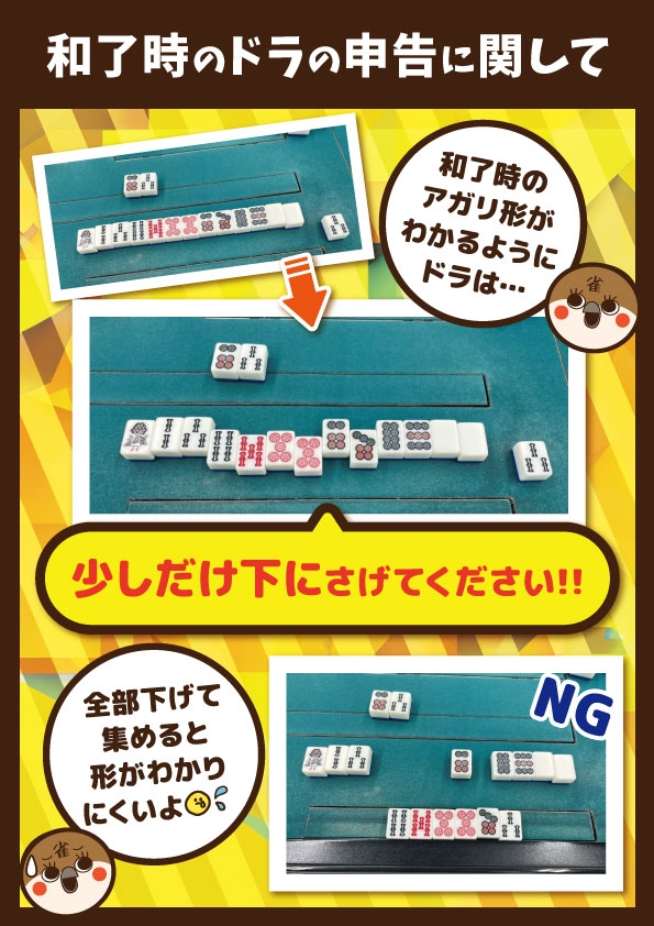 ・チョンボ時の積み棒はそのまま。チョンボ発覚時、倒牌済、続行不可能な際は即チョンボになる。続行可能な際は、流局チョンボになる。