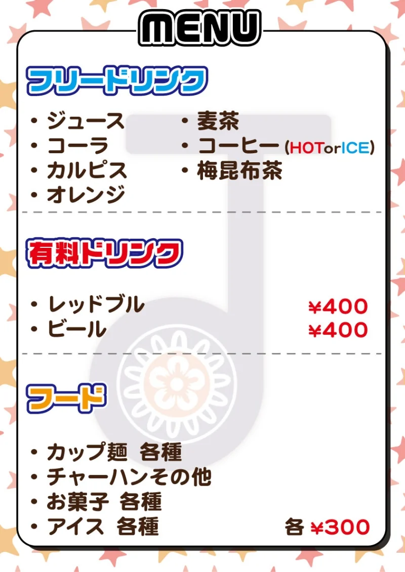 | ドリンク メニュー | フリードリンク ・ジュース ・コーラ ・カルピス ・オレンジ ・麦茶 ・コーヒー(HOT・ICE) ・梅昆布茶 有料ドリンク 各種400円 ・レッドブル ・ビール |