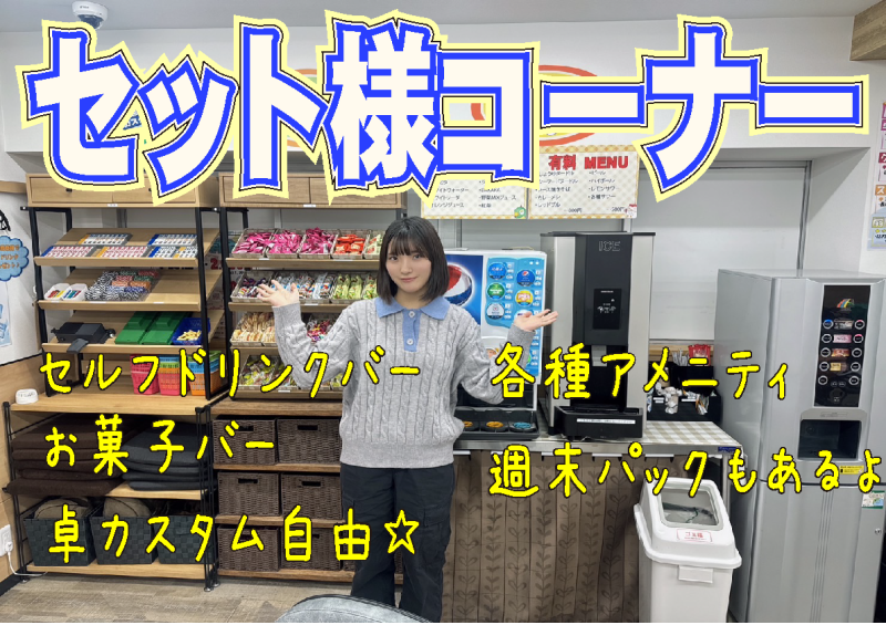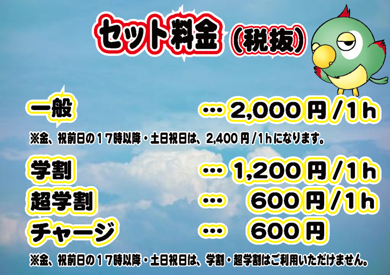 | 料金 (セット) | 平日9-17 1,200(税込み) 平日17-24 2,400(税込み) 金曜日、祝前日17-24 2,600(税込み) 土日、祝日9-24 2,600(税込み) ※卓利用料金が、土曜日は18,000円、日曜日祝日は15,000円を超えた場合、自動でパックに切り替わります。 |