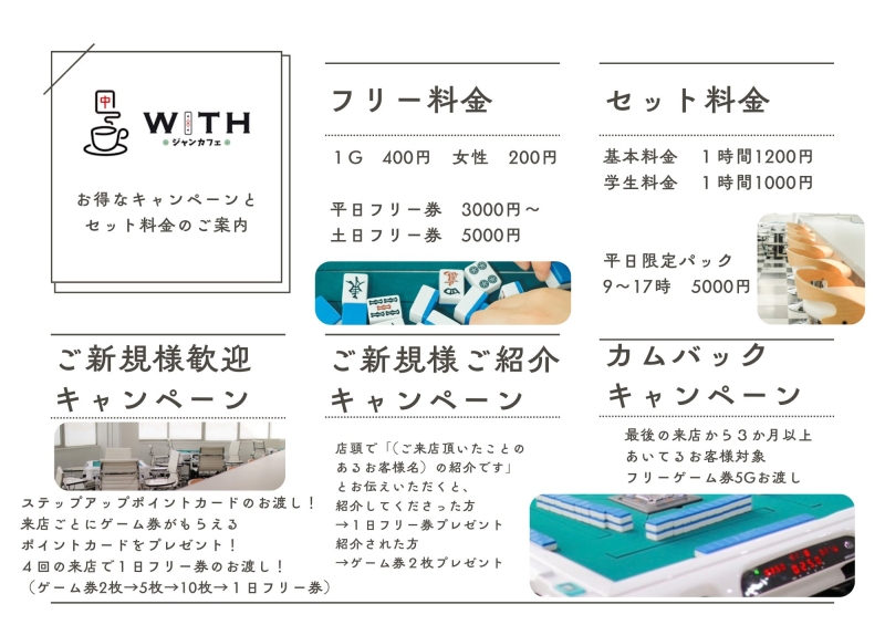 | お店のPR | 2021/11/6オープンの3周年を迎えました、『ジャンカフェWITH』です! 当店は、楽しいお店づくりを目指し、スタッフ一同心のこもった接客と清潔な空間を提供できるように努めております♬ ★ジャンカフェWITHの推しポイント★ ・毎日朝の9時から営業中! 朝からフリーをご利用されるお客様にむけてお得な早割(10時までの来店で終日ゲーム代半額)をご用意! セット利用なら9~17時最大8時間がドリンク込で4000円! ※17時以降は通常料金+フリードリンク代を頂戴いたします。 ・店内全卓AMOSREXXⅢを採用! 大人気Mリーグと同じ雀卓を6卓ご用意しています。 フリー(1G400円)、貸卓、セット利用(1卓1時間1200円)でご利用できます! ※上記料金は、早割や平日パック適用外の料金です。 ・駅近だけど車でのご来店もお得!? 当店では、提携駐車場を完備しているためお車でのご来店も可能! 一日中利用しても平日1000円!土日祝は500円で利用できます。 また、近隣駐車場をご利用のお客様には、規定回数ご遊戯頂けるとゲーム券のお渡し! ※駐車券や駐車してる写真をご提示ください。 ・女性スタッフ多数在籍! フリーデビューのお客様を初めとして、 女性のお客様にも快適に安心して過ごして頂けるように常時女性スタッフが出勤しています。 女性のお客様はゲーム代半額の1G200円です! ・簡単ルールで符計算もなし! まだ麻雀を初めて日が浅い方や、雀荘に慣れていないお客様でもご利用いただけるように 難しいルールや符計算は採用していません! 分からないことがあっても大丈夫!スタッフがサポートさせていただきます! ・常時キャンペーンやイベント開催中! ジャンカフェWITHでは、ご新規様だけでなく普段からご来店頂いているお客様にもより一層楽しんで頂けるように常にキャンペーンやイベントを開催しています! イベント開催中は賑やかで楽しい空間となっております♪ 各種イベントやキャンペーンは詳細ページをご覧ください! ★ジャンカフェWITHの楽しみ方★ ジャンカフェWITHでは、カウンター席をご用意しているため スタッフとおしゃべりしたり一緒にお酒を飲んだり、 もちろんお食事のみのご利用も可能です♪ フードドリンクメニュー多数ご用意しているのでぜひお立ち寄りください(*'ω'*) |
