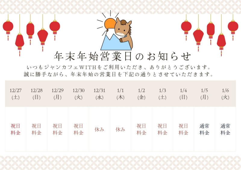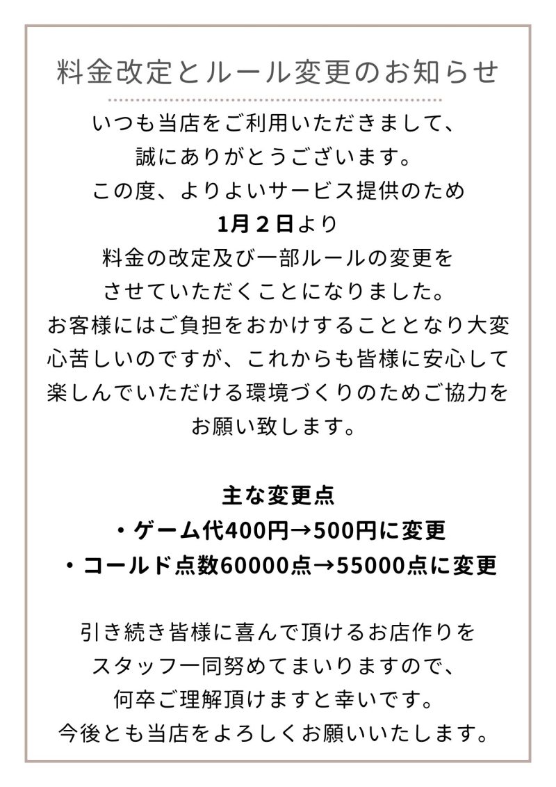 この度、当店では1月2日より料金改定とルール変更をさせていただくことになりました。