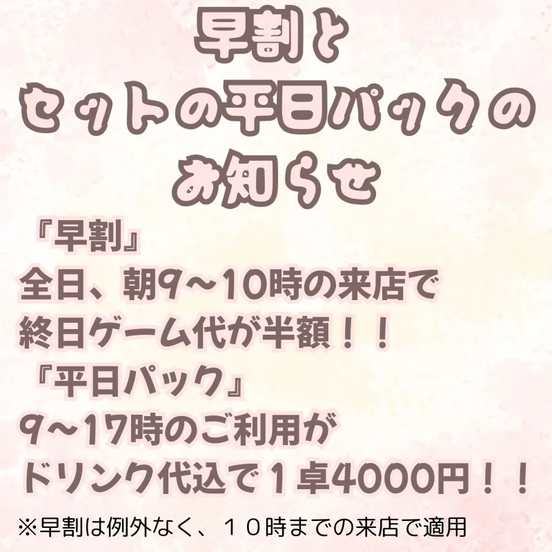 『平日土日の10時までにご来店頂いたお客様全員終日ゲーム代半額の200円』になります!