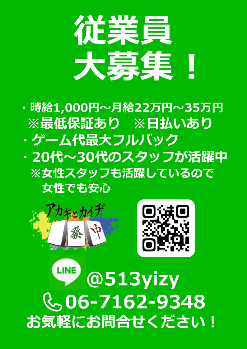 ☆貸卓・個室¥900/h~☆3人打フリー☆アカギとカイヂ☆天満橋☆女性スタッフ在籍☆競馬中継☆