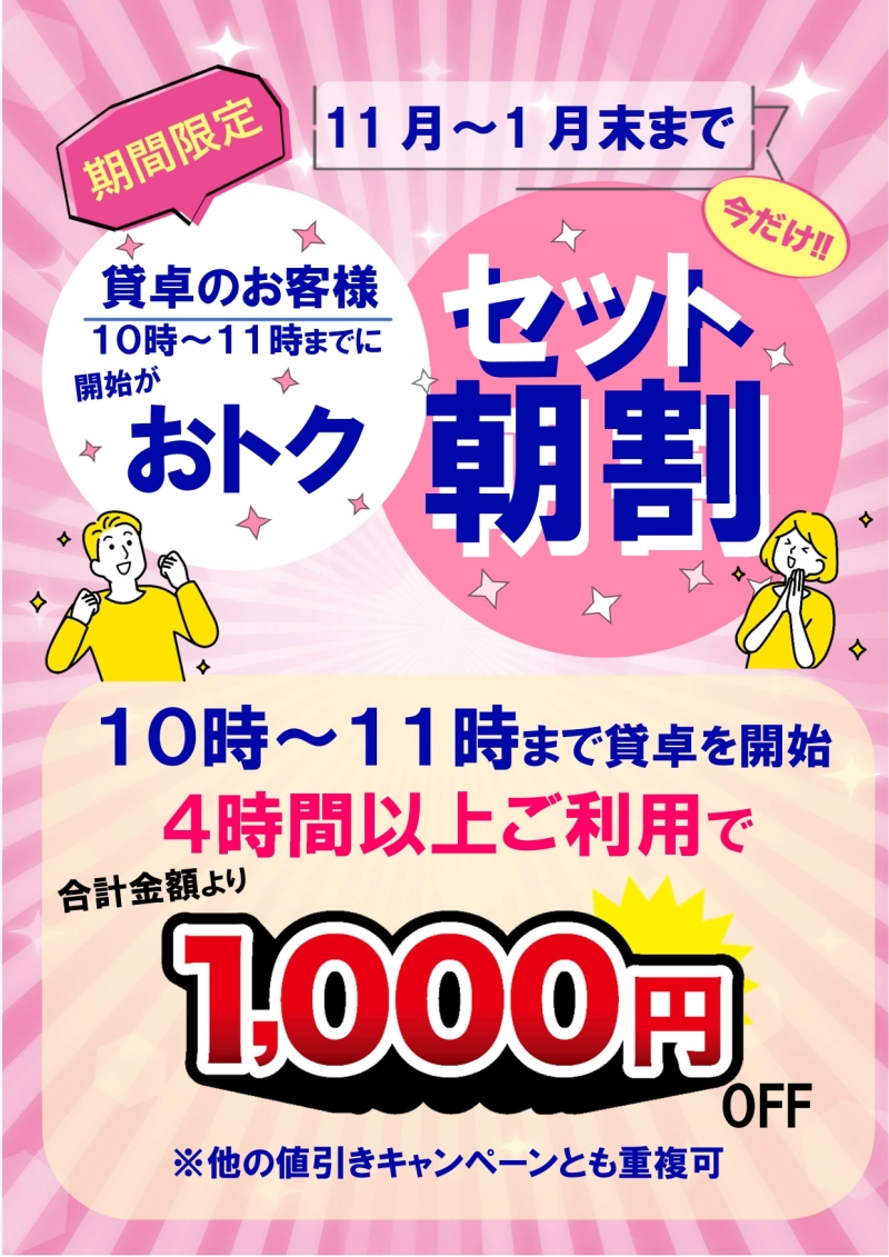 | 料金 (フリー) | 1ゲーム 500円 期間限定! フリー朝割 早起きは3文の『得』!! 開店後30分以内にご来店頂いたお客様は初回ゲーム代サービス☆ |