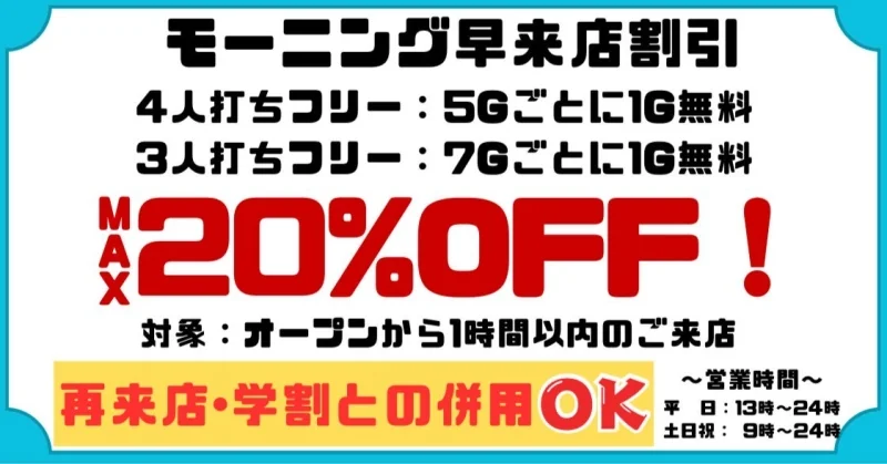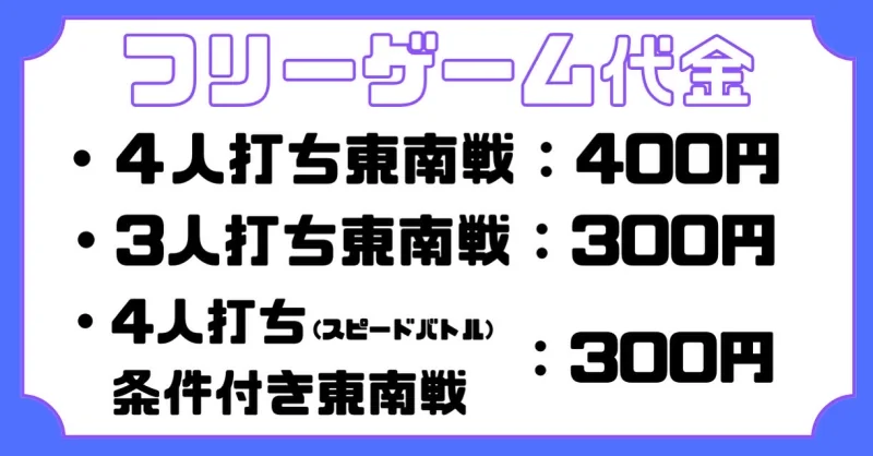 | 料金 (フリー) | 4人打ち:400円/1G 3人打ち:300円/1G *4人打ちルールは学生半額!女性100円引き! |