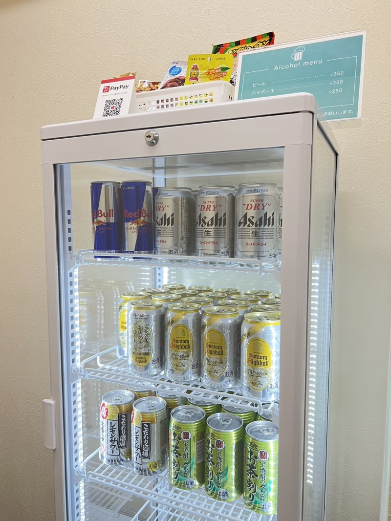 | ドリンク メニュー | 店内にセルフ簡易コンビニございます。 お水:100円 お茶、ソフトドリンク:200円 エナジードリンク(レッドブル、モンスター):300円 レモンサワー:250円 緑茶ハイ:250円 角ハイボール:350円 アサヒスーパードライ:350円 |