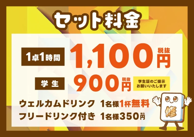 | 料金 (セット) | 1卓1時間 1,100円 (学生 900円)※学生証提示 |