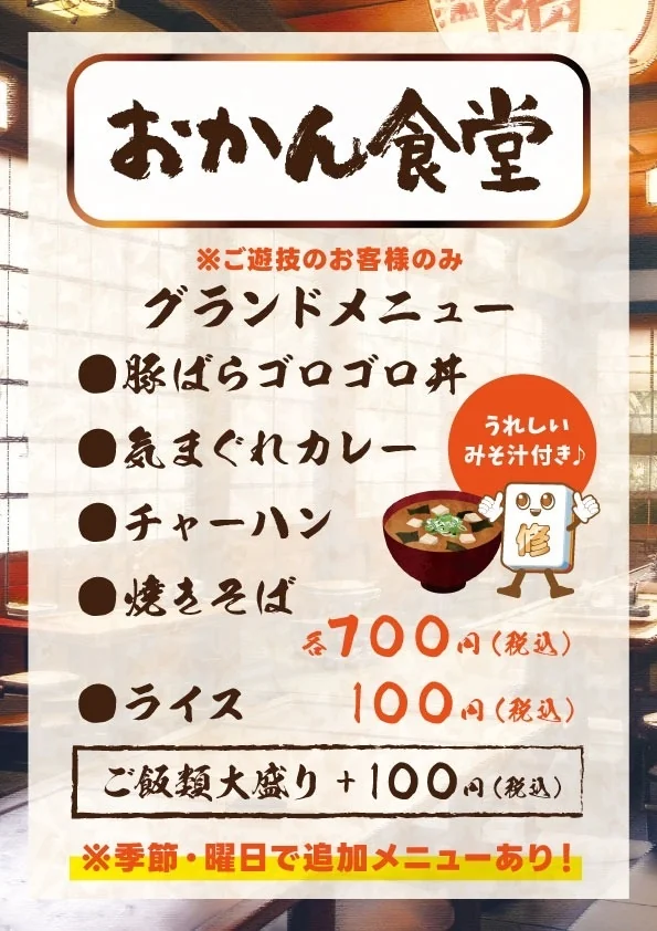 | 料金 (その他) | おかん食堂 1食700円 ※ご遊戯のお客様のみ フリーのお客様は9ゲームご遊戯で無料! (お1人様1日1食まで) |