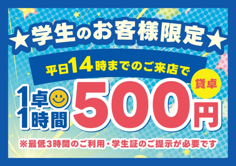 ※最低3時間ご利用・学生証のご提示をお願いいたします