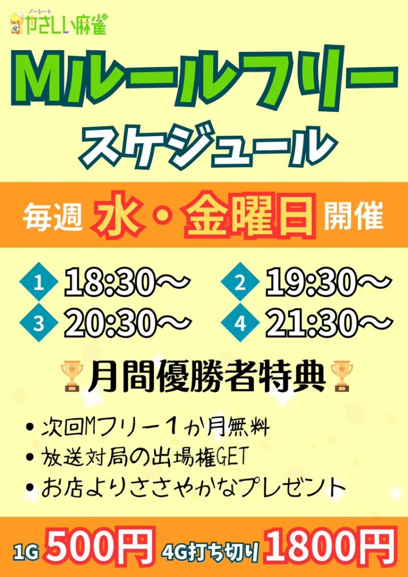 | 料金 (フリー) | 三人打ちノーレートフリー 料金表 1時間 600円 1日打ち放題 5,000円 Mリーグフリー(毎週水曜日・金曜日18:30~開催)料金表 1ゲーム 500円 4ゲーム打ち切り 1,800円 |