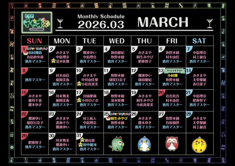 | 料金 (その他) | タイムチャージ:1h 660円 飲み放題(90分):3,300円 自動延長(30分):1,100円 スタッフドリンク:880円 チェキ:1,100円 *表記は全て税込価格です *飲み放題はチャージ込の価格です |