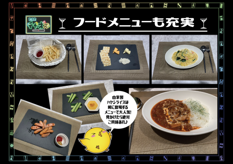 | フード メニュー | チーズ・パスタ・カレー・チャーハン・ピザ・牛丼・肉うどん:880円 かけうどん・ソーセージ・ナゲット・ポテト・チョコ:550円 枝豆:330円 |