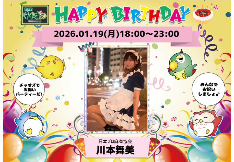 藤川さんと仲良しの日本プロ麻雀連盟所属の中川由佳梨プロと一緒にチャオズに来てみんなでお祝いしましょう!!