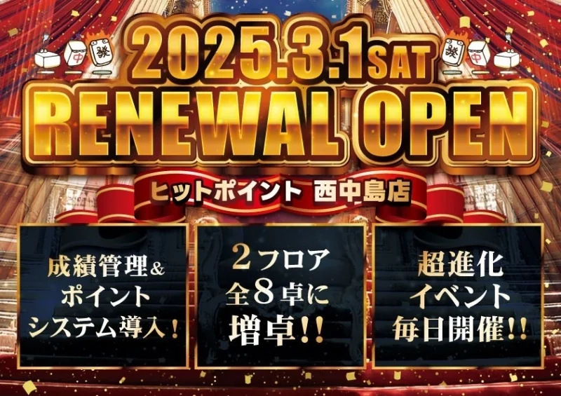 ※月間アクセス数での順位2025年3月リニューアルオープン!麻雀ヒットポイント西中島店です♪