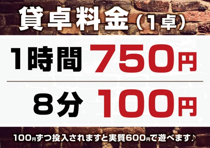 | 料金 (セット) | 1卓1時間 750円 1卓8分 100円 ※100円ずつ投入されますと、実質600円で遊べます! |