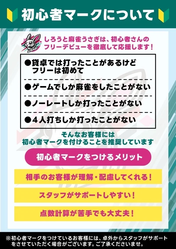 店名にもあるように、「しろうと」の方も大歓迎ですので、富田林にお越しの方は、ぜひ「しろうと麻雀うさぎ」へ!!