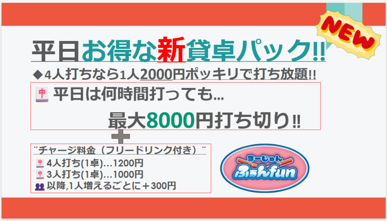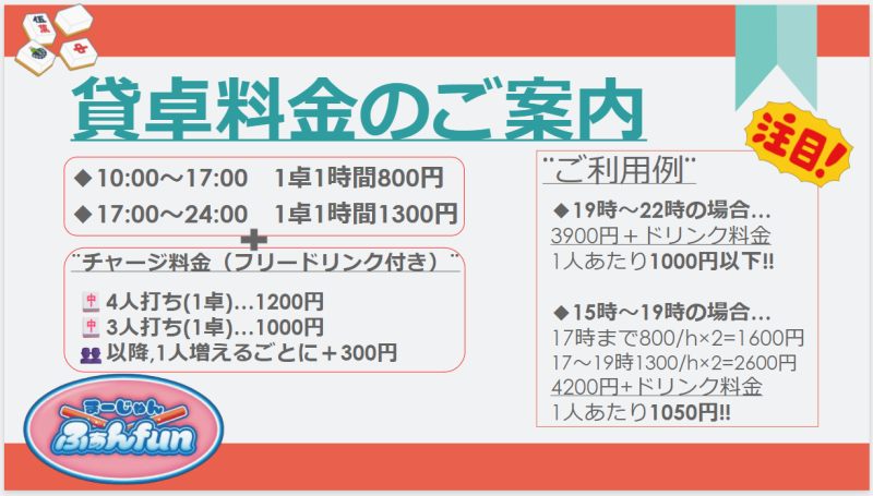 | 料金 (セット) | 1卓1時間あたり料金 10時~17時: 800円 17時~24時:1300円 昼パック:平日10時〜17時まで1卓4000円 土日祝日は10時〜17時まで卓4000円 終日パック:1日打ち放題1卓10000円 |