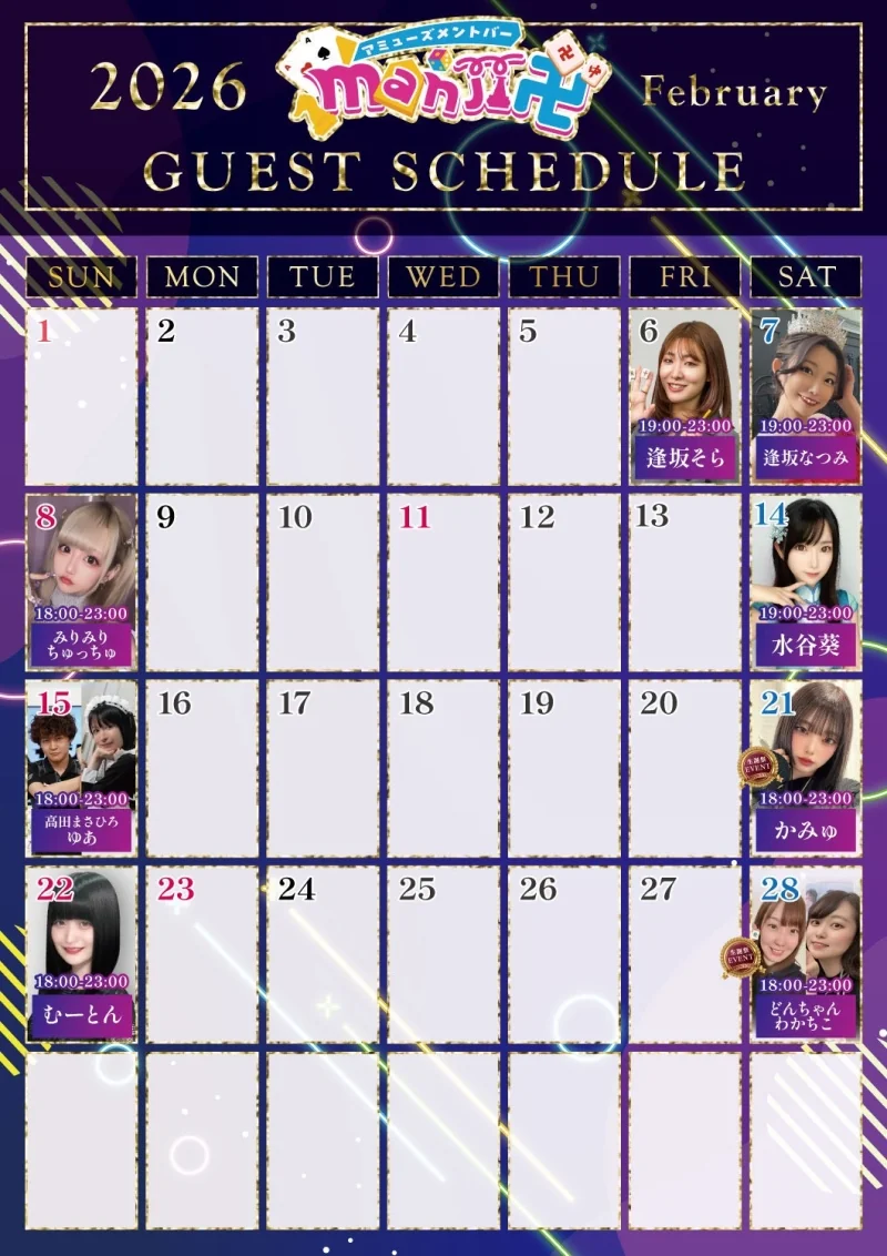 | 営業時間 | 全日:19時~23時(基本的にゲスト出勤日に営業しております) ゲストにより、OPEN時間もしくはCLOSE時間が前後する場合がございます。 |