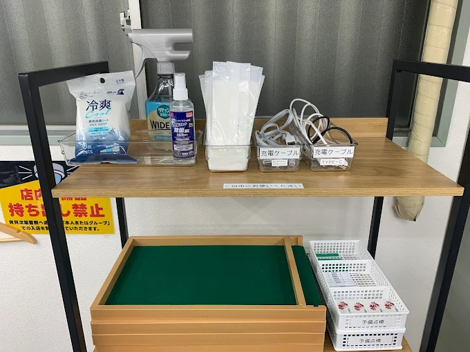 おしぼり、充電用コード(卓にUSB差込口あり)、汗拭きシート、ファブリーズなどあります。