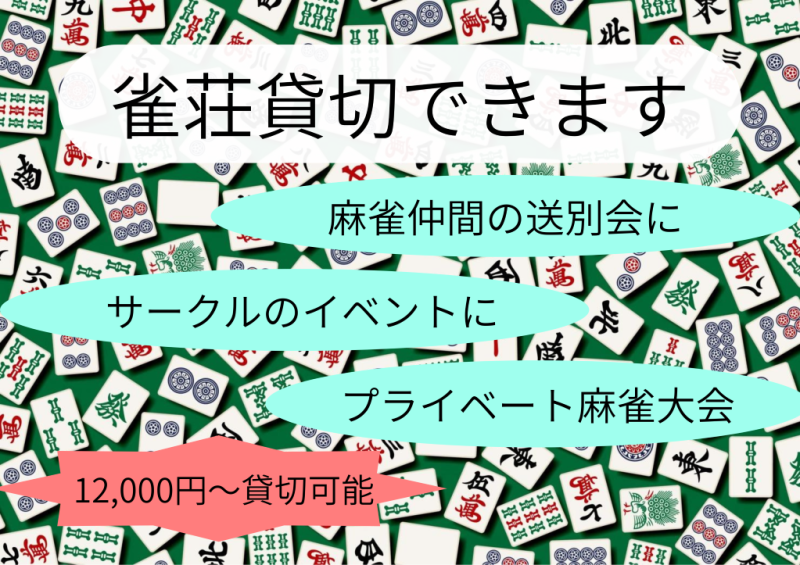 | お店のPR | 阪急大宮駅から徒歩4分!地下鉄四条駅から徒歩9分! 1卓1時間666円!(45分500円)京都最安の雀荘がNewオープン!フリードリンク付き! コインタイマー式のセルフ雀荘が初めての方でも簡単にご遊戯可能です。是非お気軽にご来店ください。 ご不明点などがある場合も丁寧に説明いたします! 持ち込み自由です。(お客様用冷蔵庫・電子レンジあり) フードも格安なので、手ぶらで来ても安心! どうぞお気軽にご来店ください! |