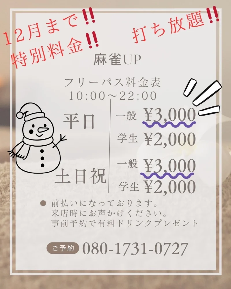 | 料金 (フリー) | ノーレートフリー お1人様1ゲーム500円 *50分+1局 6ゲームパック 2500円 フリーパス 毎日 3000円 *学生は各1000円引き、全て前払いにてお願いいたします。 |