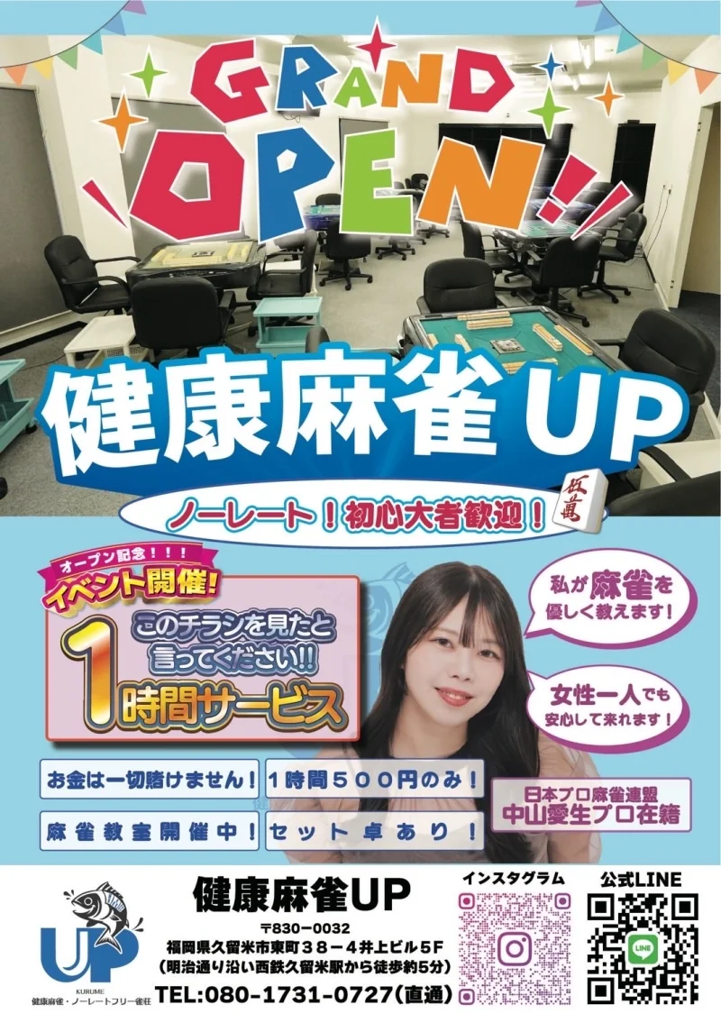 みなさんこんにちは!麻雀UPです!久留米初の健康麻雀・ノーレート雀荘が2025年10月25日にオープンいたします!