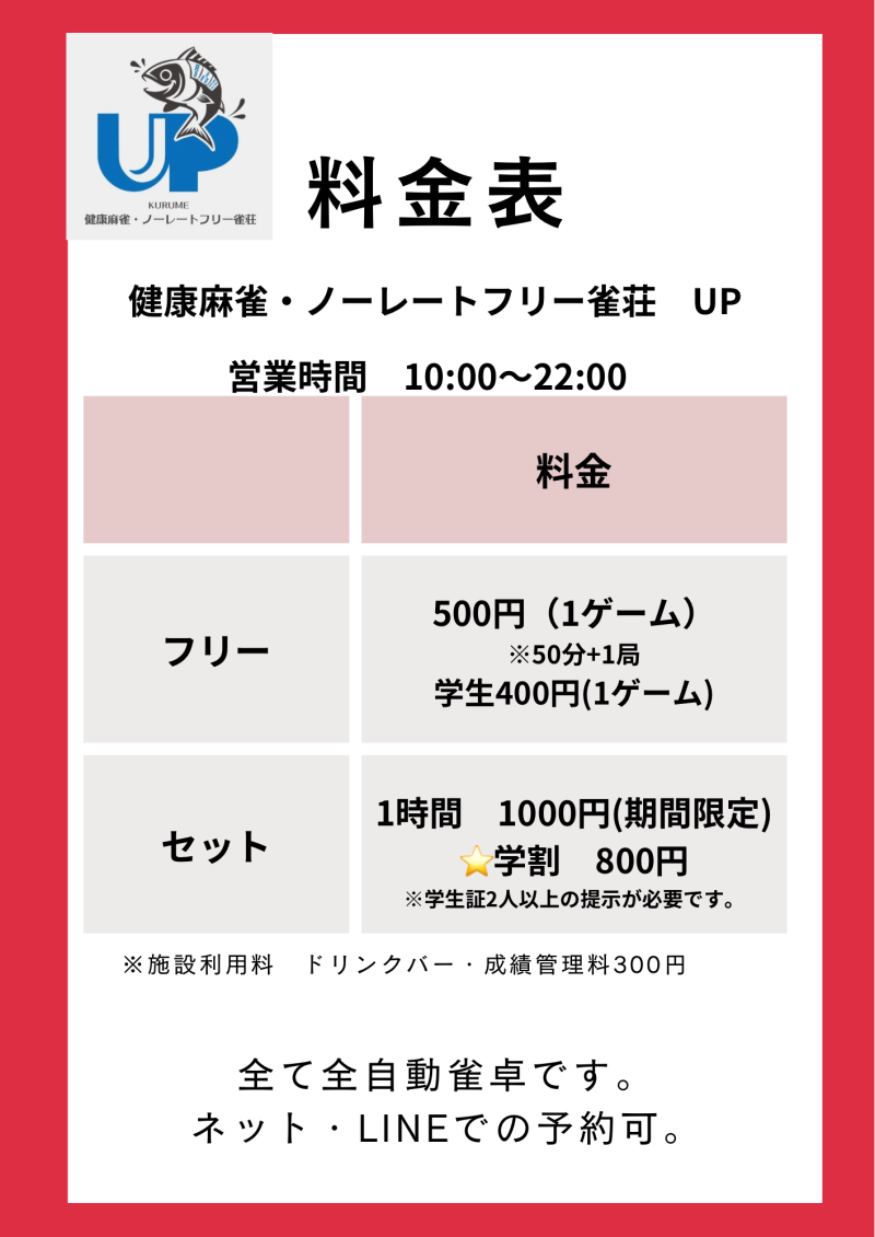 | お店のPR | みなさんこんにちは!麻雀UPです!久留米初の健康麻雀・ノーレート雀荘が2025年10月25日にオープンいたします! また全自動配牌卓の数も10卓で久留米最大級!! 1ゲーム500円で初心者の方も大歓迎です!セット卓の貸出あり!日本プロ麻雀連盟中山愛生プロ在籍! |