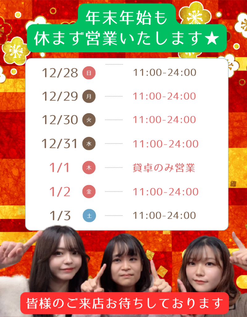 年末年始は特別営業時間となります★年末は午前中から元気に営業♪貸卓のご予約はお早めに★