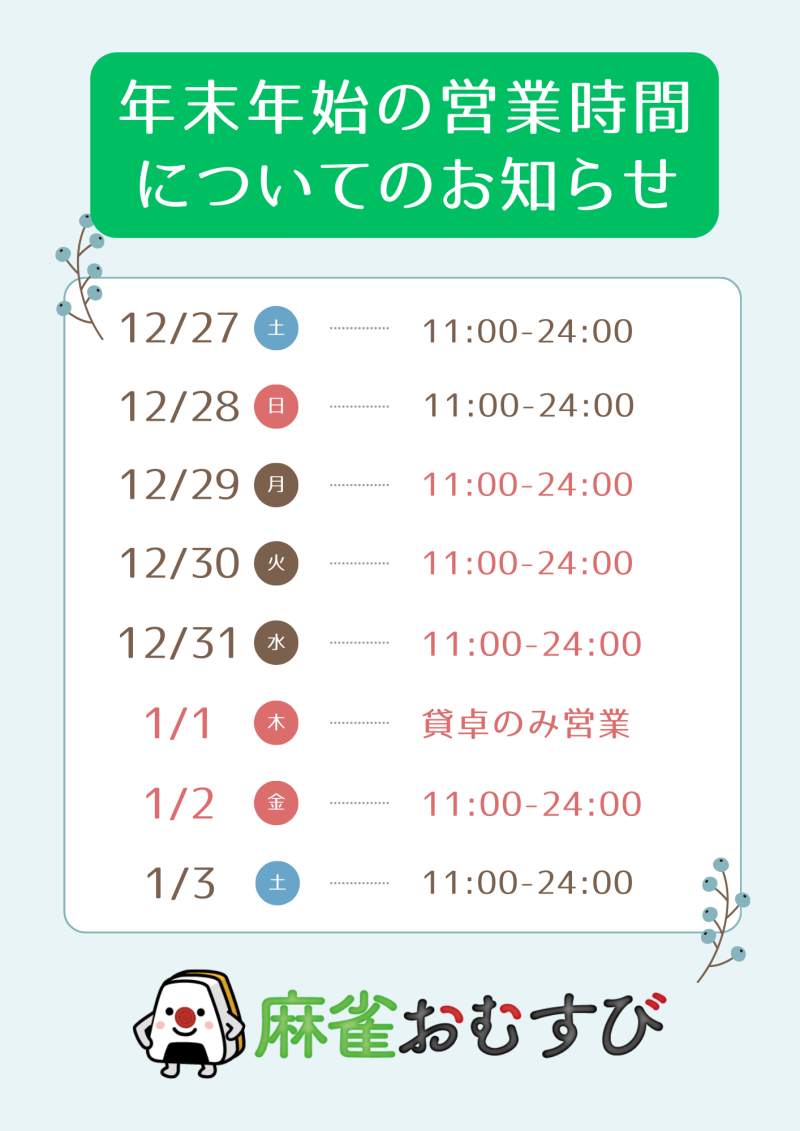 麻雀おむすびは年末年始も元気に営業いたします✨
