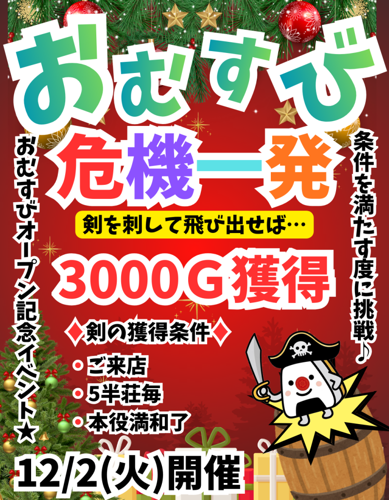 本日12月2日(火)麻雀おむすびオープン!イベントに特典に大盤振る舞い♪
