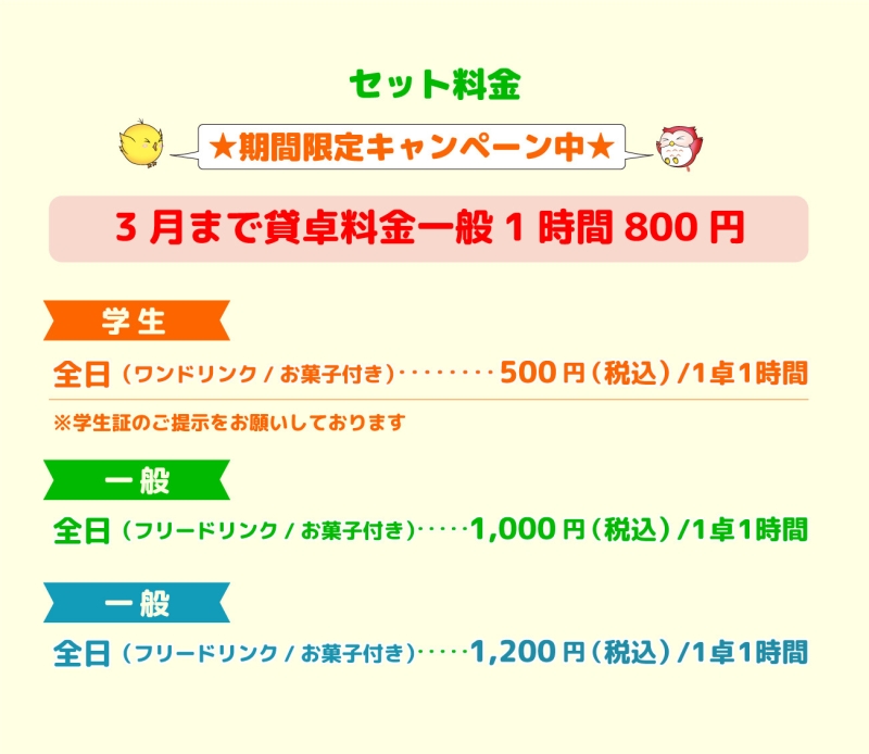 | 料金 (セット) | 一般:1卓1時間1000円(フリードリンク、お菓子付き) 学生:1卓1時間500円(ワンドリンクサービス、お菓子付き) 個室:1卓1時間1200円(フリードリンク、お菓子付き) ☆期間限定キャンペーン中☆ 2026年3月迄貸卓料金一般1時間800円!! |